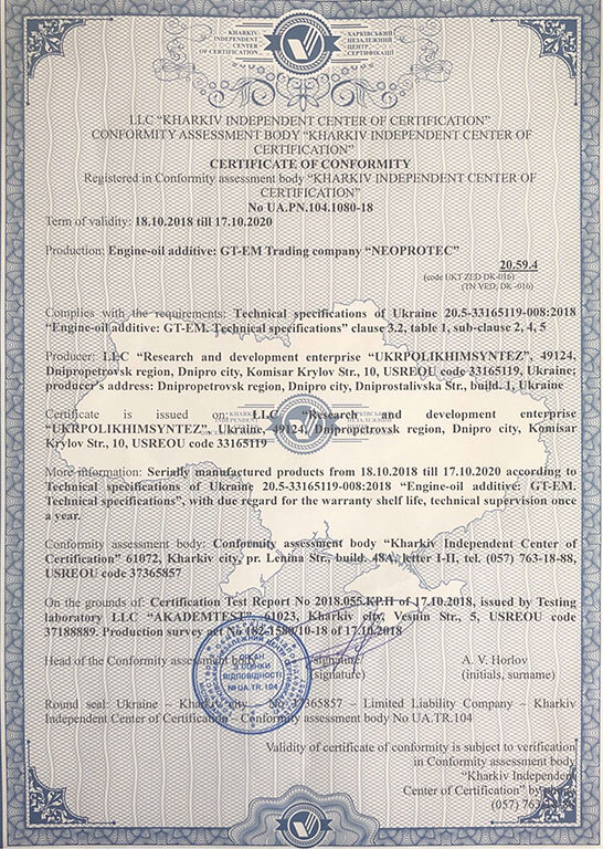 NeoProtec GT-em підсилює властивості мастил, у т.ч. і захищає його від передчасного старіння (окислення) при важких умовах експлуатації та ін..